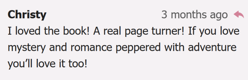 I loved the book! A real page turner! If you love mystery and romance peppered with adventure you’ll love it too!
